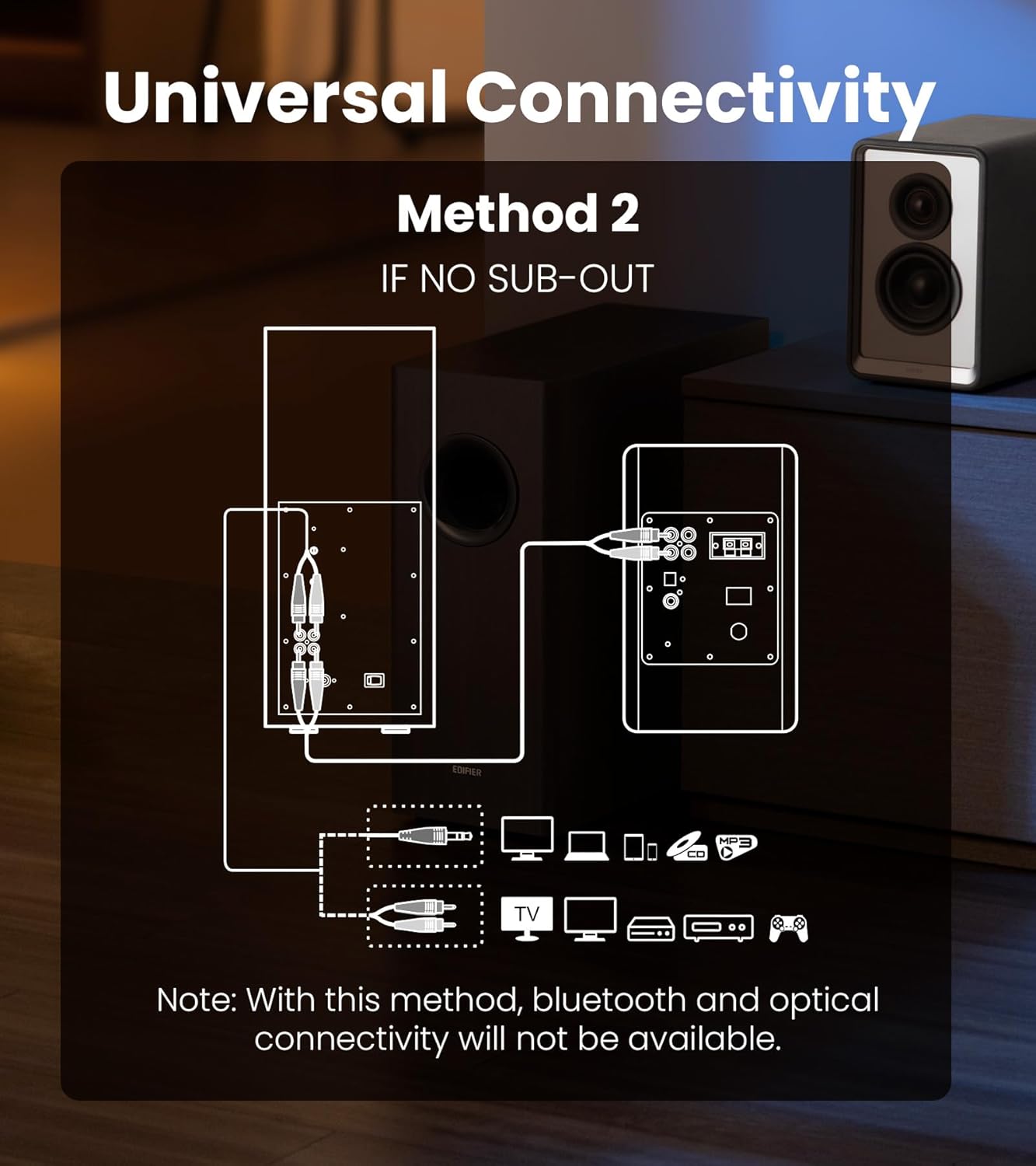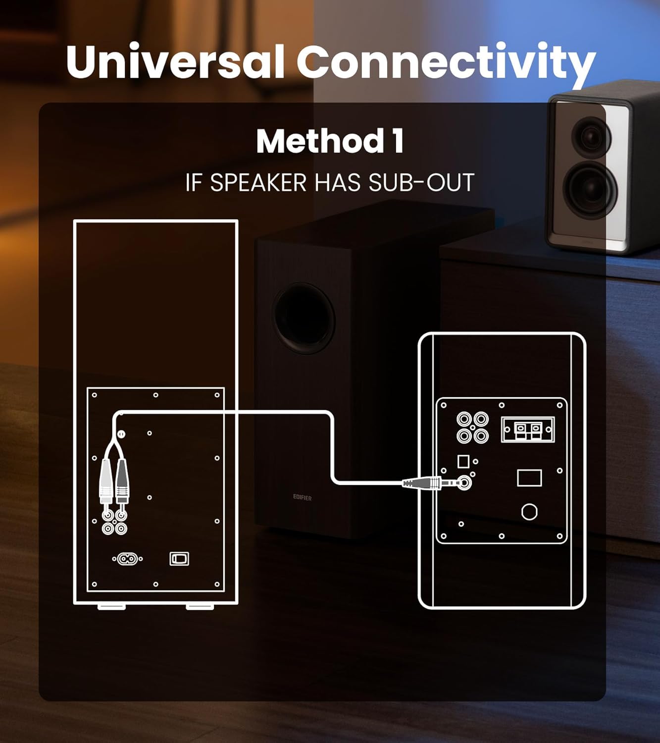 Versatile Connectivity: The dual RCA inputs/outputs (Signal In/Out) enable easy daisy-chaining with Edifier R-Series speakers (e.g. The video showcases the product in use.The video guides you through product setup.The video compares multiple products.The video shows the product being unpacked. Merchant VideoT5s Slim & Powerful Subwoofer