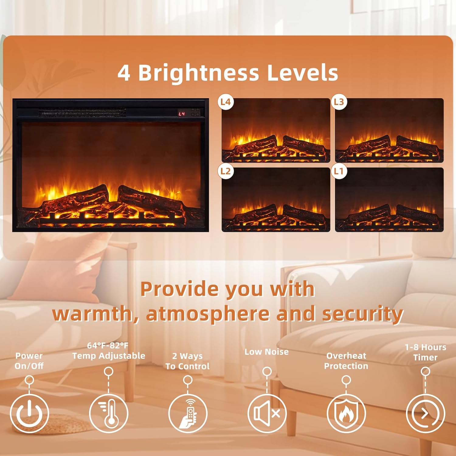 [Better Customized Atmosphere] This fireplace features 3D flame effect and 4 adjustable brightness levels. The LED lights have 20 static color and 21 dynamic modes. Its lights' brightness and flashing effect can be adjusted. The flame and temperature of the TV fireplace stand are controlled separately. You can enjoy the flame effect without starting the heat function suitable for all year round.