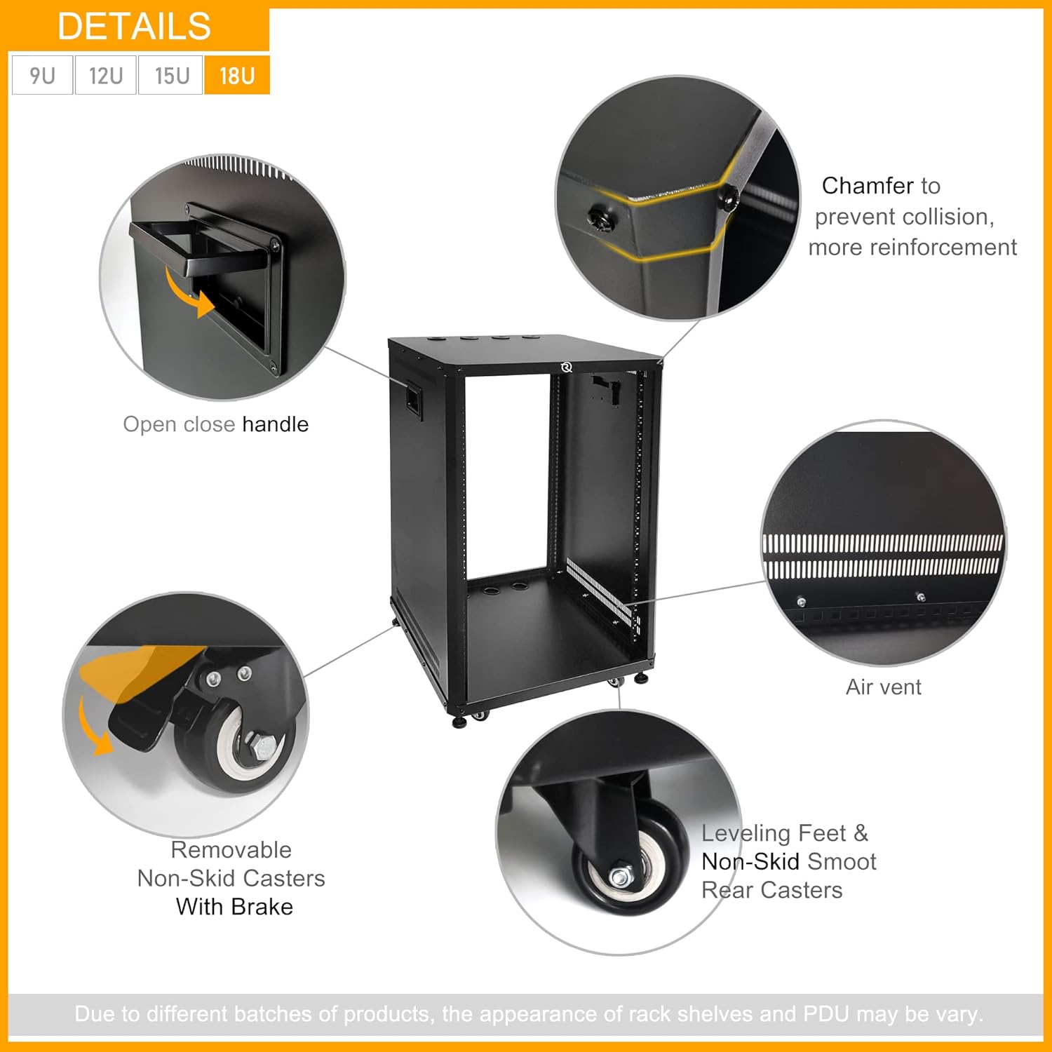 OPTIONAL RAIL HOLES & ADJUSTABLE DEPTH: This free-standing cabinet has front and rear rails. The unique design is with both round & square holes on each rail: round holes are compatible with US 5mm and European 6mm standards while square holes fit M6 & M5 screws & cage nuts. We can also by moving rails forward or backyard to fit devices depth.