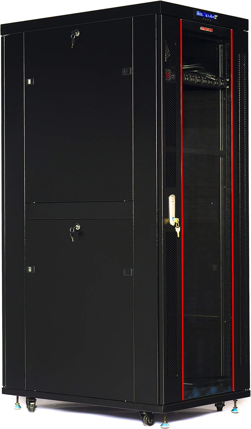 USABILITY AND SAFETY FIRST - 32 U Free Standing Network Cabinet - enclosed cabinet designed for 19 inch standard equipment. Smart technology cabinet with 4 X Cooling Fans / LCD Screen / Thermosensor / Dust-Proof Cable entries guarantee stability and performance of your project. Adjustable Depth Vertical mounting rails will fit any server "32U SERVER CABINET SYSRACKS with Thermosystem - 4 x Cooling Fans - shelf - Casters - 8-Socket Powerbar and more. Types of doors: Front Glass in metal frame with perforation Rear Solid metal Framework Cable input: Top and bottom have dust-tight brush panels Ventilation: Passive convection heat flow due to perforation of front and rear doors Active Temperature Control System with 4 fans (all models) IP protection: IP41: glass/perforated sash IP20: perforated door Capacity: Static load not exceeding 1600 lb. Material: Rolled steel profile Frame thickness:1.2 mm; 19 profiles 2mm; side panels:1.0 mm; other components parts:1.2 mm Coating: Powder paint with degreasing and anticorrosive phosphate Color: Black: RAL9005 TECHNICAL PARAMETERS: Dimensions (Exterior): 32U 24""x39""x66"" Usable Depth: 28 Vertical U-Mark Mounting Rails Adjustable to 28-inch apart Color: Black Loading Capacity: Up to 1600 lbs Coating: Powder paint with decreasing and anti-corrosive phosphate Weight: 260 lbs Ventilation: Active 4 cooling fans /Temperature Control System Passive internal air flow circulation due FEATURES: 4 X Powerful Cooling Fans 37U 42U different depths and models. Visit our store for more models and accessories. Replacement parts available for all models.