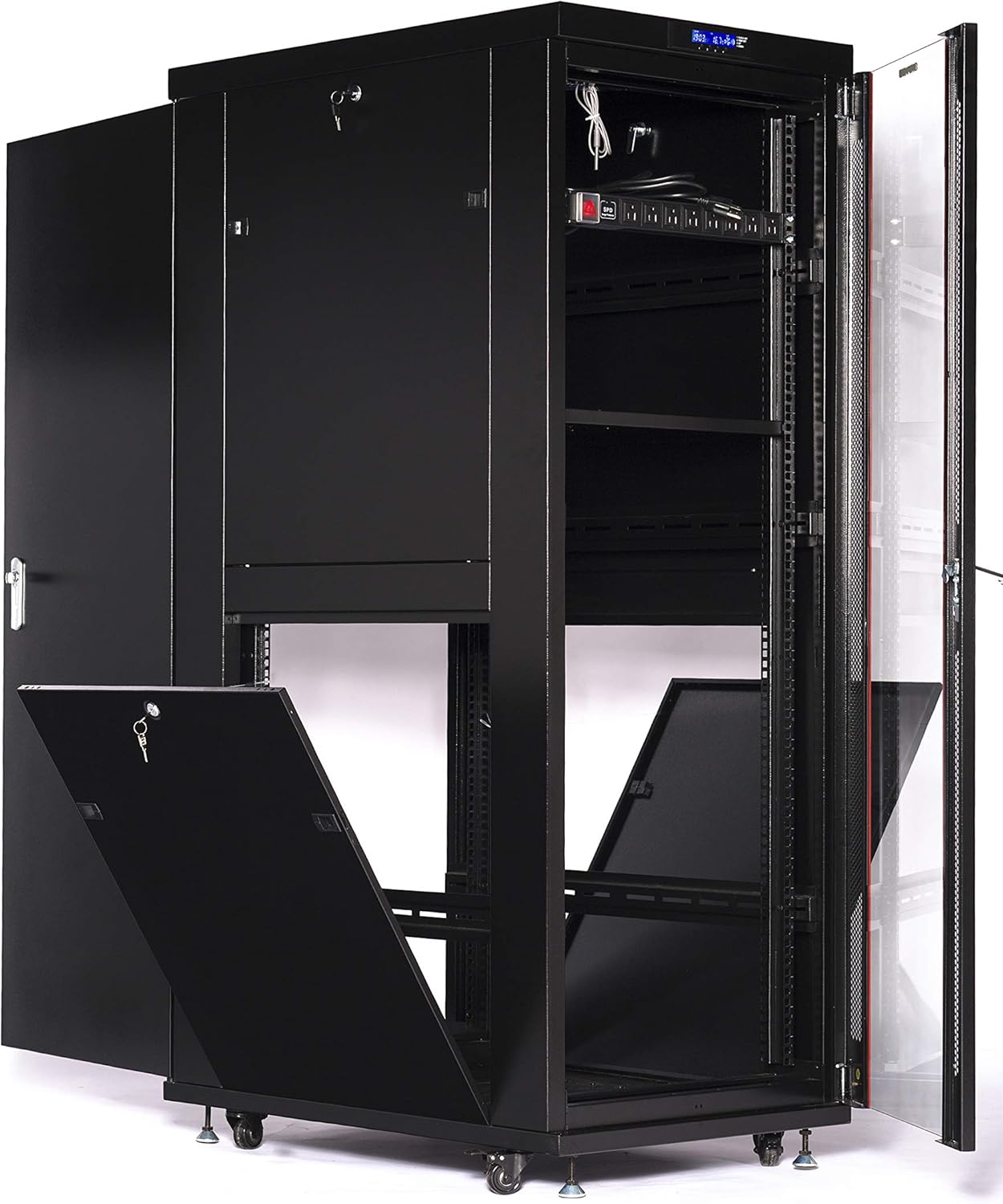 DetailWHAT'S INCLUDED: - we Don't Want You To Have To Pay Extra For Your Next Project Essentials. The 32 U Av Rack Mount Comes With: thermostat With Thermosensor lcd Screen 4 Cooling Fans 2 X Dust-tight Cable Entries 8-outlet Powerbar casters With Stoppers heavy Duty Shelf mounting Cage Bolt/nut Hardware fully Locking Cabinet Doors/side Panels - 4 Keys